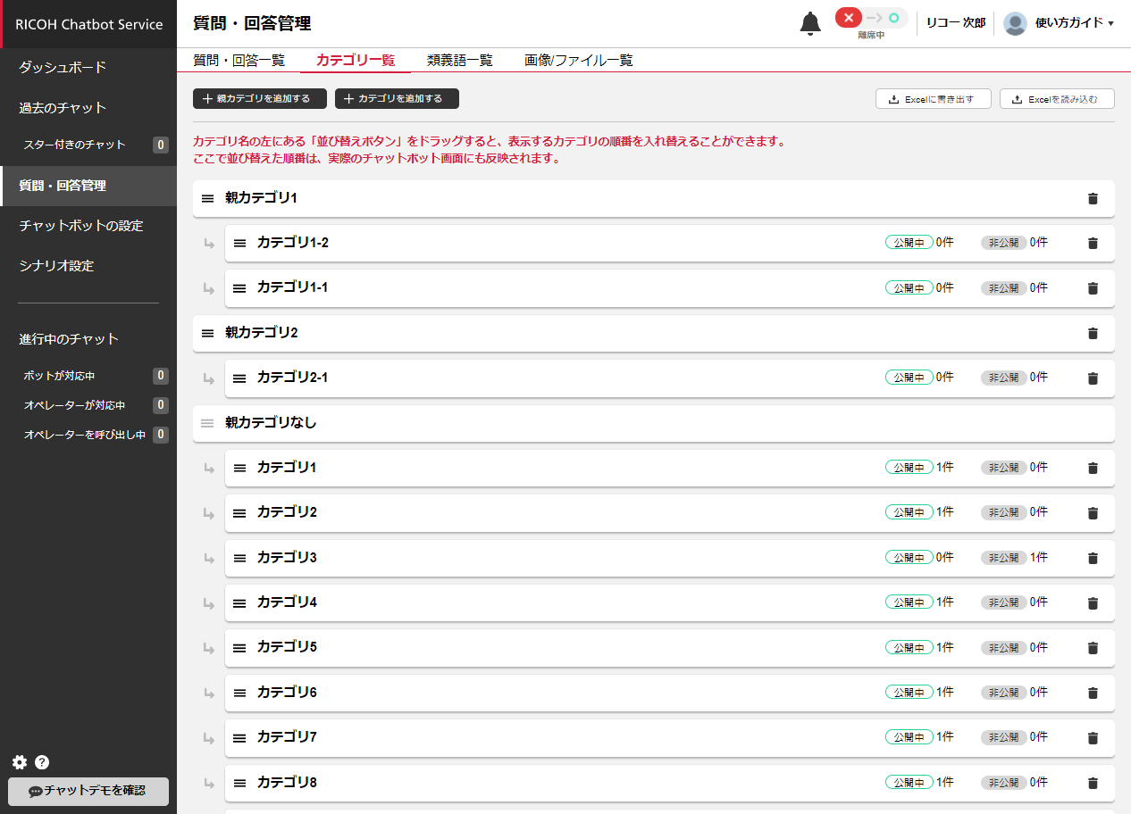 カテゴリは左側のアイコンをドラッグしながら移動することで、上下の順番を入れ替えることができます。この順番は、チャットボットとの会話でカテゴリを表示する際の表示順に反映されます。
