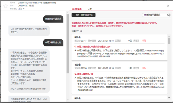 管理サイトの過去のチャットで、チャットボットとユーザーのやりとりの詳細を確認し、[精度改善タブ]から回答できなかった質問や不満足だった質問の修正や新規の質問・回答の作成ができます。