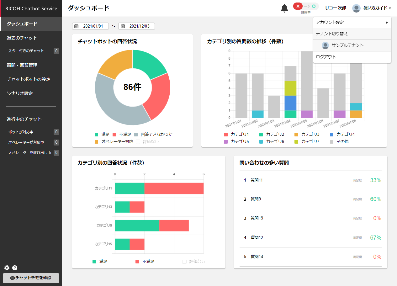 RICOH Chatbot Serviceでは、チャットボットをテナントという単位で管理しています。複数のチャットボットをご契約の場合、下記の操作で閲覧するテナントを切り替えることができます。