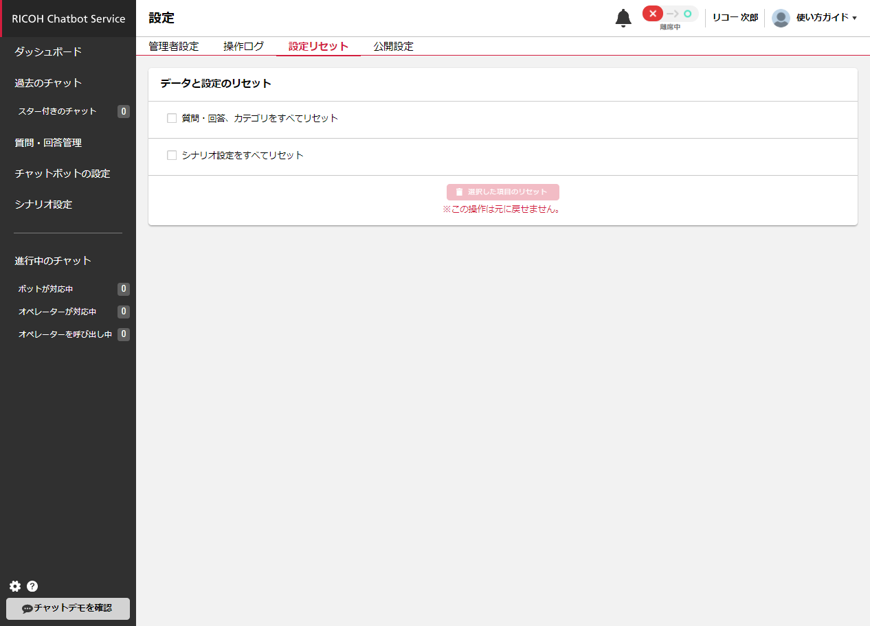 - [質問・回答、カテゴリをすべてリセット]にチェックを入れ、[選択した項目のリセット]クリックします。