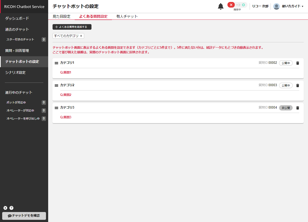 入れ替えたい項目の左側にある[三]アイコンをドラッグしながら移動することで、上下の順番を入れ替えることができます。この順番は、チャットボットとの会話の表示順に反映されます。