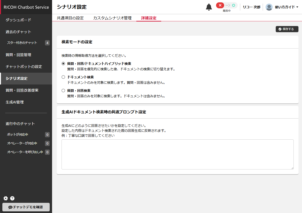 自由入力時のチャットボットの検索モードを切り替えることができます。