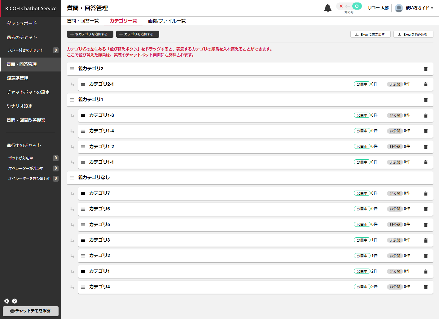 カテゴリは左側のアイコンをドラッグしながら移動することで、上下の順番を入れ替えることができます。この順番は、チャットボットとの会話でカテゴリを表示する際の表示順に反映されます。