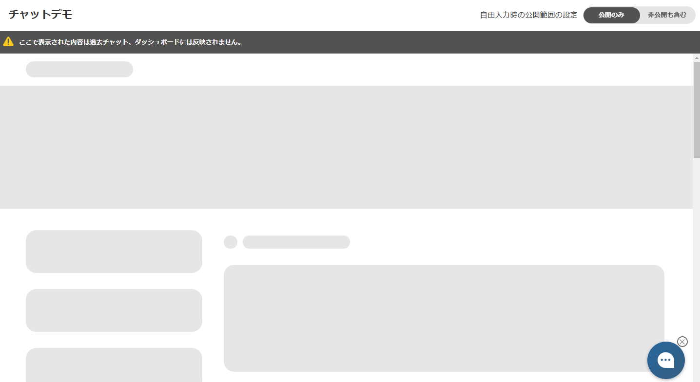 チャットボットの見た目や表示位置、問い合わせ結果を確認することができます。 ここで表示された内容は過去のチャット、ダッシュボードには反映されません。