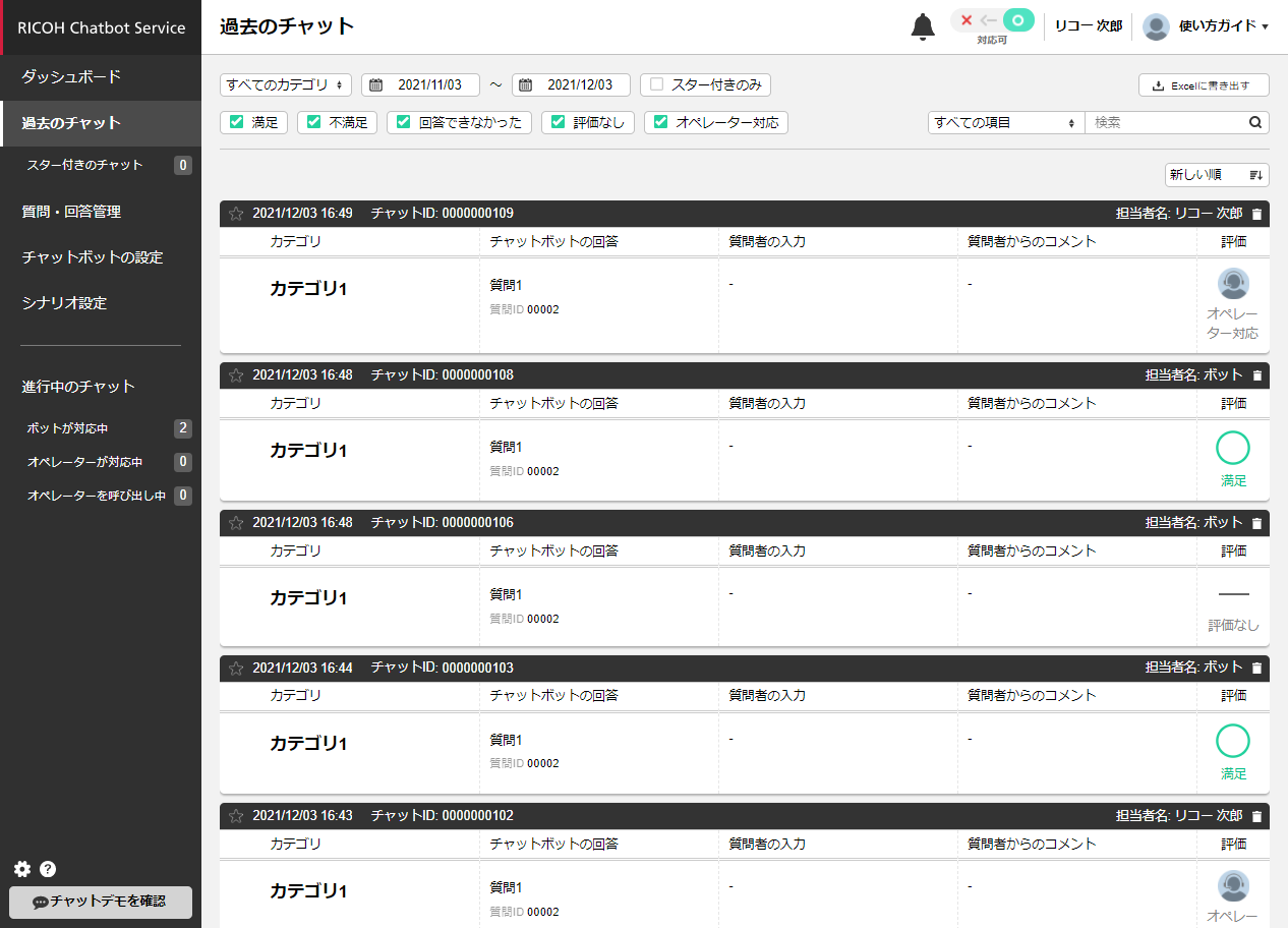 過去の詳細チャットは、チャットの内容や質問者などを確認することができます。