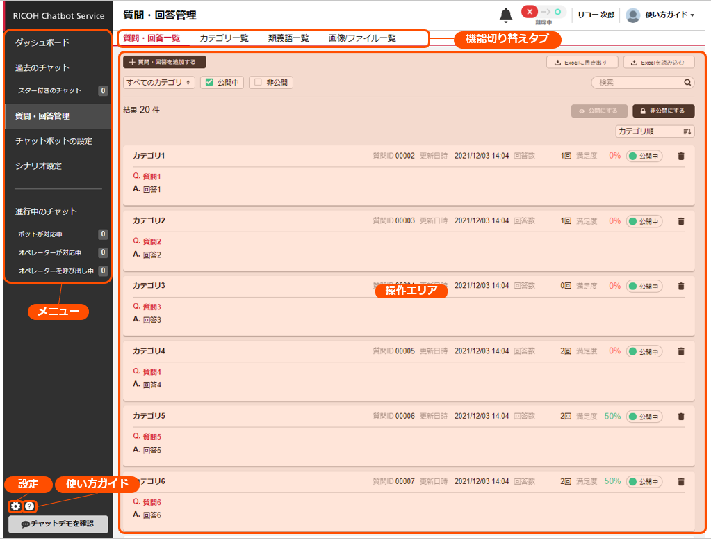 管理サイトでは、チャットボットが行う回答やセリフ、見た目などを設定できます。 また、チャットのログや質問の傾向などのチャットボットに集まる情報を確認できます。
