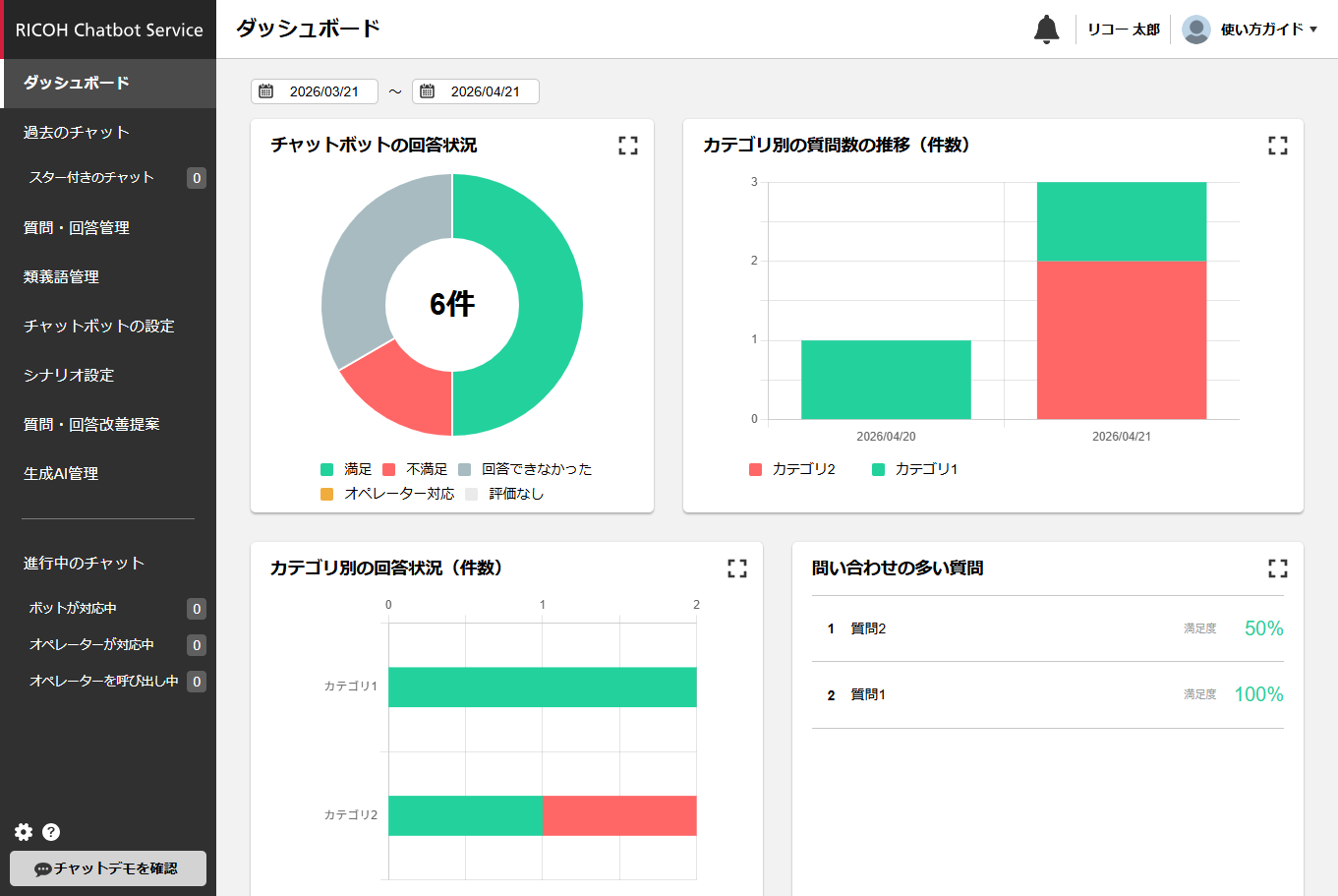 管理サイトのダッシュボードでチャットボットの回答状況などを確認することができます。 ダッシュボードを確認しながら、回答できていない質問を修正、またはナレッジを追加してください。また、質問が多くされていながら満足度の低いカテゴリは、不足している質問がある可能性が考えられます。 不足している質問・回答を追加することを検討してください。また、質問が多くされていながら満足度の低いドキュメントは、不足している情報がある可能性が考えられます。ナレッジの内容を確認してください。